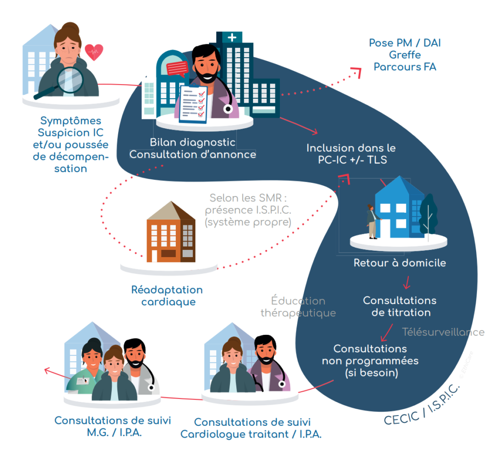 Pour optimiser le parcours des patients insuffisants cardiaques sévères, le projet prévoit d’associer 6 modules complémentaires. L’organisation repose sur la structuration de Cellules d’Expertise et de Coordination de l’Insuffisance Cardiaque Sévère (CECICS) composées d’infirmiers de coordination (IDEC) « délégués » et de cardiologues « délégants » qui mettent en œuvre un protocole de coopération entre professionnels de santé (autorisé sur le plan national par arrêté ministériel le 27/12/2019).