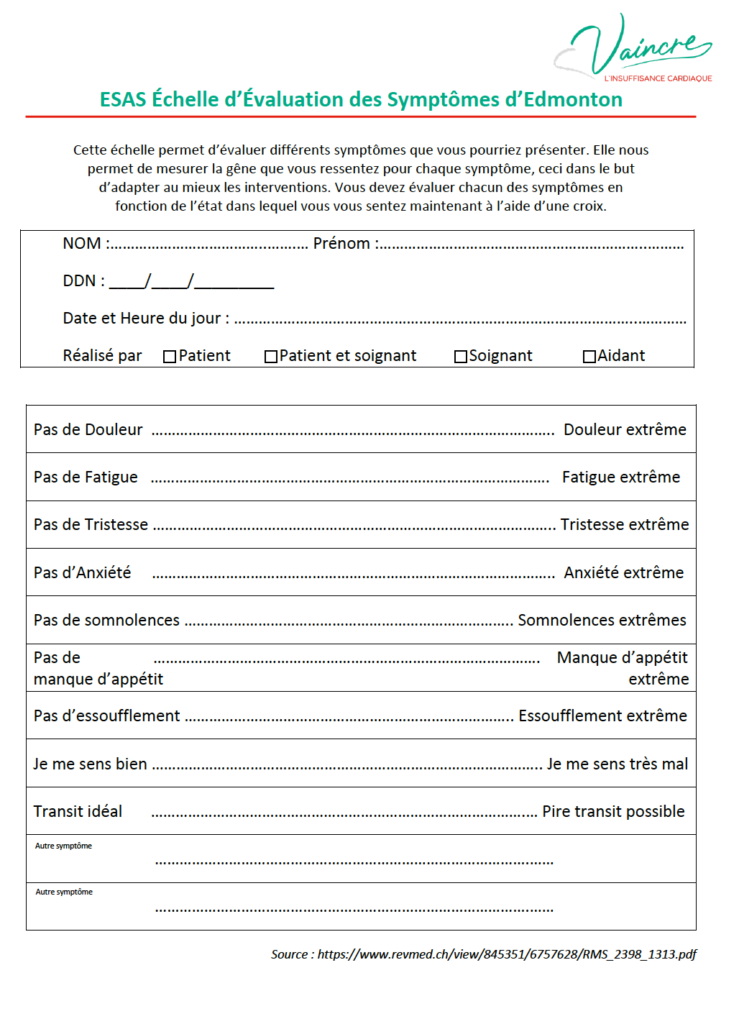 L’équipe médicale peut également s’appuyer sur la présence de symptômes et leur évaluation. Par exemple, l’Échelle d’évaluation des symptômes d’Edmonton (ESAS) en auto-évaluation, à l’origine, pour les patients cancéreux peut être utlisée en IC. Elle évalue les symptômes les plus courants en soins palliatifs : douleur, dyspnée, fatigue, somnolence, appétit, anxiété, déprime, bien-être et autres symptômes éventuels.