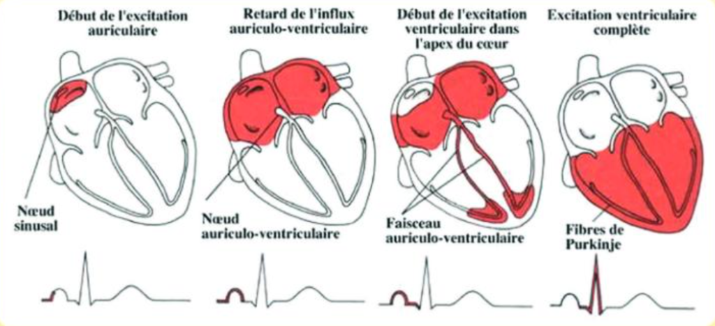 Le courant électrique débute par le noeud sinusal, il stimule les deux ventricules qui se contractent.