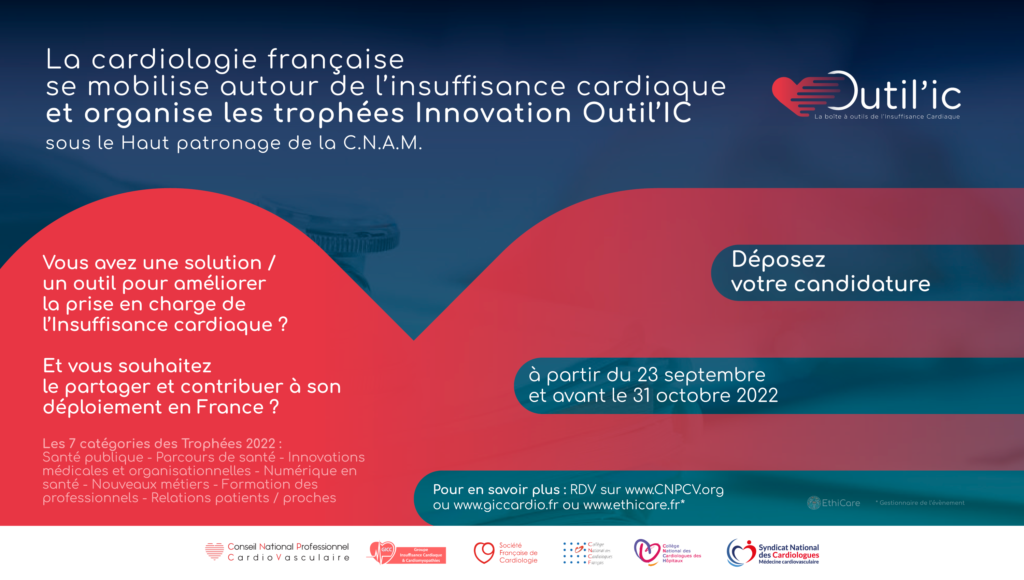 Ce concours a pour vocation de faire de la prise en charge de l’insuffisance cardiaque un élément structurant du système de santé. Il est destiné à valoriser et à promouvoir les initiatives portées par les professionnels de santé français et à améliorer le suivi de l’insuffisance cardiaque en France et les prises en charge grâce à l’émergence de pratiques communes innovantes et au développement d’outils opérationnels diffusés à grande échelle. Organisée sous le haut patronage de la C.N.A.M. par le CNPCV (Groupe Insuffisance Cardiaque & Cardiomyopathies – GICC, Société Française de Cardiologie – SFC, Collège National des Cardiologues Français – CNCF, Collège national des. Cardiologues des Hôpitaux – CNCH, Syndicat National des Cardiologues – SNC), l’édition 2022 des Trophées de l’insuffisance cardiaque se déroulera du 23 septembre 2022 au 10 mars 2023.